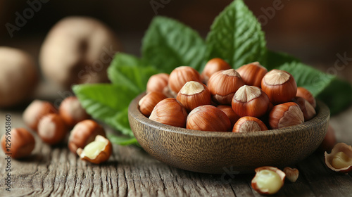 A rustic bowl brimming with vibrant hazelnuts captures the essence of culinary delight. The surrounding fresh green leaves enhance the rich, natural beauty of this wholesome setup