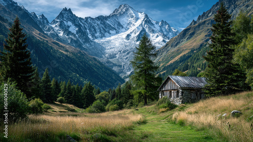 A rustic cabin nestles in a mountain valley, surrounded by trees and a stunning alpine landscape