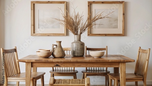 A rustic dining area features a wooden table set with matching wooden tea service items, including a teapot, a milk jug, a sugar bowl, and a teacup with a saucer.