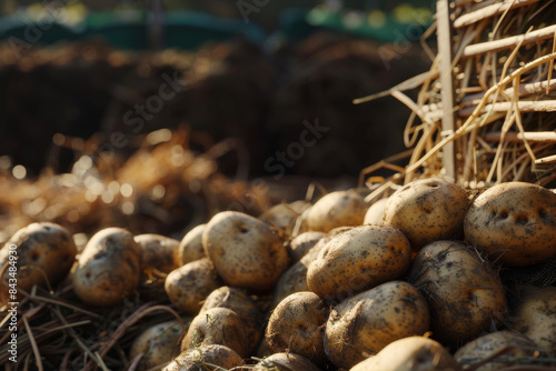 A rustic farm scene with freshly harvested potatoes in warm sunlight, emphasizing their earthy texture.
