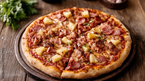 A rustic Hawaiian pizza with fresh pineapple and sliced ham on a crispy crust, covered with melted cheese, creating a perfect balance between sweet and savory.