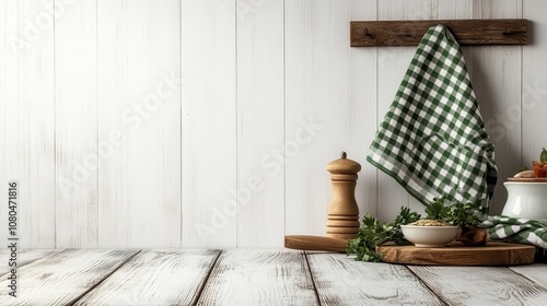 A rustic kitchen scene featuring a green checkered towel, pepper mill, fresh herbs, and wooden decor elicits warmth and country charm, perfect for cozy interiors.