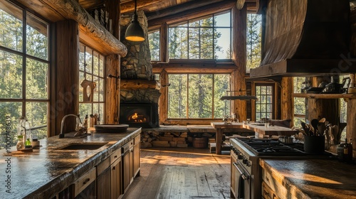 A rustic log cabin kitchen, with wooden floors, stone countertops, and a large hearth, framed by large windows with views of the forest