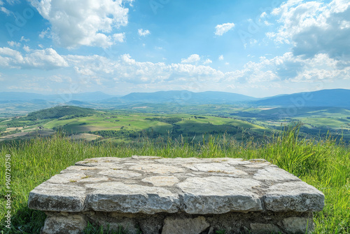 rustic, stone, dais, natural, texture, set, background, rolling, green, hill, bright, blue, sky, creating, serene, scene