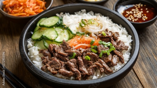A rustic table spread with beef rice, accompanied by pickled vegetables and a small bowl of dipping sauce, creating a flavorful and colorful meal presentation.