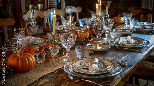 rustic, thanksgiving, dinner, table, warm, ambient, lighting, burlap, runner, fine, china, crystal, goggles, autumn leaf, pumpkin, candle