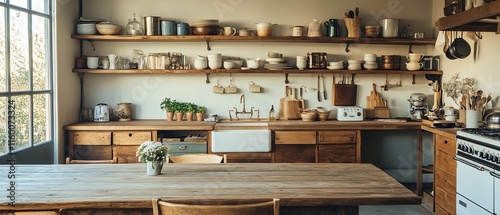 A rustic vintage kitchen with a farmhouse dining table, antique kitchenware, and open shelves, creating a timeless, warm atmosphere
