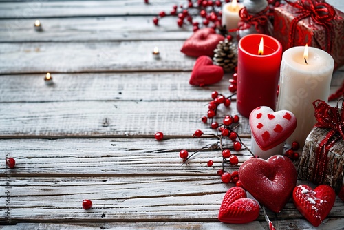 A rustic white backdrop adorned with crimson hearts, presents, and lit candles, symbolizing the celebration of Valentine's Day.