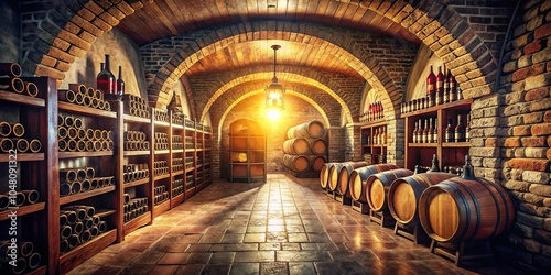 wine cellar, brick, arched, bottle, barrel, rustic, warm, inviting, atmospheric, light, shadow, vintage, cellar, wine, storage, ageing, fermentation, tradition, craftsmanship, quality, beverage, alcohol, drink