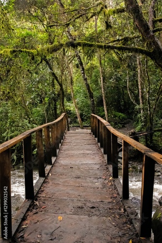A rustic wooden bridge crosses a small river in a dense, misty cloud forest, surrounded by moss-covered trees and vibrant green foliage