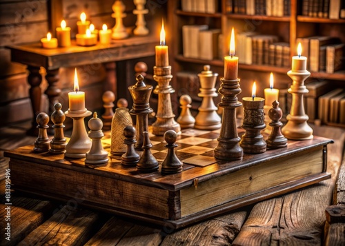 A rustic wooden chessboard with intricately carved pieces sits on a worn, vintage-inspired table, surrounded by scattered books and dimly lit candles, evoking warmth and camaraderie.