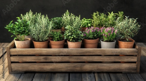 A rustic wooden crate filled with various potted herbs and flowers perfect for home decor or gardening