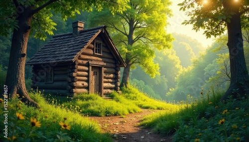 A rustic wooden hut nestled amidst a vibrant, lush green forest, bathed in the warm glow of sunlight Ideal for fairytale, nature, and wilderness themes , shelter, landscape, retreat