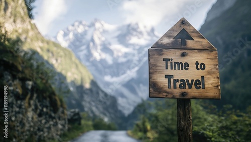 A rustic wooden sign labeled Time to Travel stands along a winding path surrounded by lush green hills and majestic mountains under a bright sky, encouraging exploration.