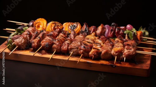 A rustic wooden table adorned with an array of BBQ pork and chicken skewers, each piece showcasing the enticing interplay of charred edges and juicy meat.