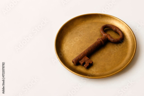 A rusty key lies on a round golden plate. Space for text.