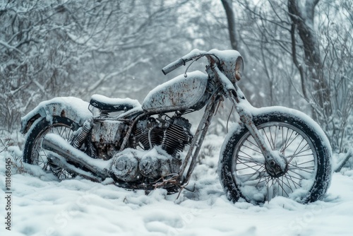 motorcycle, vintage, rust-eaten, snow, winter, forest, abandoned, old, classic, bike, chopper, snow-covered, cold, outdoors, nature, rusty metal, forgotten, weathered, desolate, winter landscape, tire, wheel, engine, machine, transportation, vehicle, scenery, glacé, stillness, quiet, peaceful, serene, monochrome, grey, white, dark, shadow