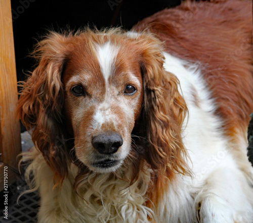 A sad eyed old brown and white dog watches the world go by.