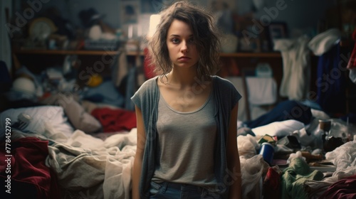 A sad girl sitting in the middle of a cluttered room, suggestive of cleaning and restoration.