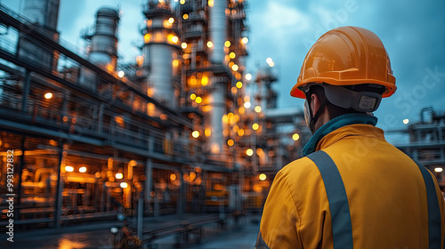 A safety worker in protective gear watches the operations of a bustling industrial facility as dusk falls, with lights illuminating the scene
