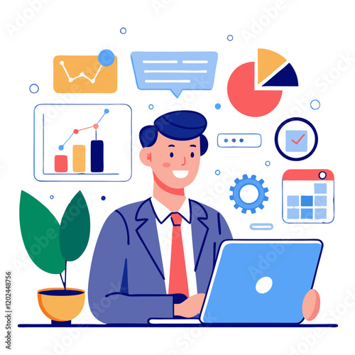 sales manager, crm, productivity, laptop, chart, graph, communication, teamwork, organisation, time management, workflow, efficiency, technology, success, planning, reporting, collaboration, engagement, visualisation, business, computer, businessman, icon, cyberspace, vector, symbol, office, illustration
