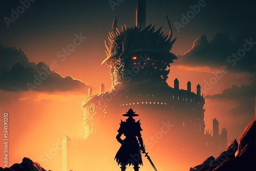 A Samurai boy standing on the field and looking at the tower. digital style. illustration. digital illustration. Digital painting. Generative AI