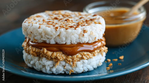 A sandwich of rice cakes with peanut butter. wholesome protein snack.