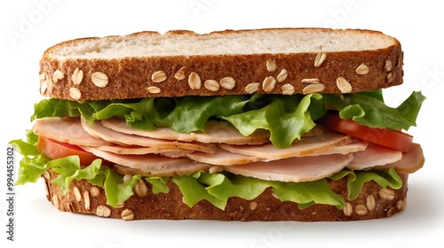 A sandwich with turkey, lettuce, and tomato on whole-grain bread