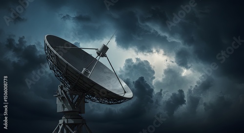 satellite dish, storm cloud, antennae, signal, reception, scene, detail, contrast, communication, weather, silhouette, technology, horizon, gathering, dark sky, drama, vantage, sharpened
