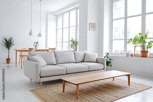 A Scandinavian mid-century modern interior photo of a modern living room in a windowed, white-finished living room. Generative AI