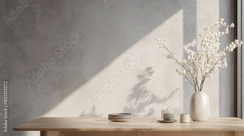 A Scandinavian-inspired dining area with a light oak table, minimalist tableware, and a single vase of flowers, placed against a cool gray backdrop with abstract design elements