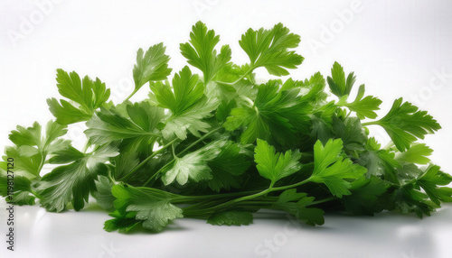 A scatter of fresh parsley leaves with intricate details, their vibrant green hues and fine textures clearly visible against a clean white background, showcasing the freshness and beauty of the herb.