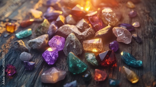A scattered array of rough gemstones on a rustic wooden table, illuminated by warm, diffused light for a natural look