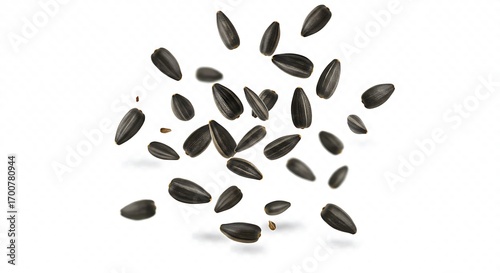 sunflower, seed, scattering, black, striped, shell, food, snack, ingredient, natural, organic, healthy, nourishment, protein, oil, agriculture, harvest, plant, botanical, seed, kernel, edible, raw, unprocessed, whole, texture, pattern, detail, closeup, macro, isolated, studio, white background, clean, simple, modern, dynamic, motion, movement, floating, suspended, falling, flying, energy, vitality, growth, nature, snack food