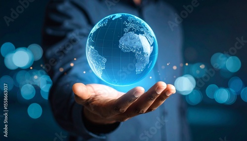 A scene in which a man raises his hand and a digital globe-shaped object rotates in his palm