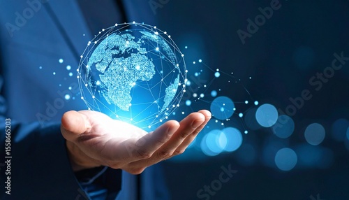 A scene in which a man raises his hand and a digital globe-shaped object rotates in his palm