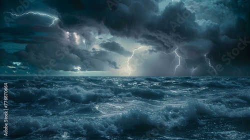 A scene of a thunderstorm over the ocean, with lightning illuminating the waves.