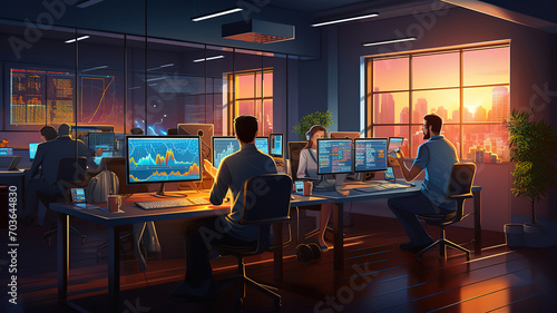 A scene showcasing a team of software developers coding, collaborating