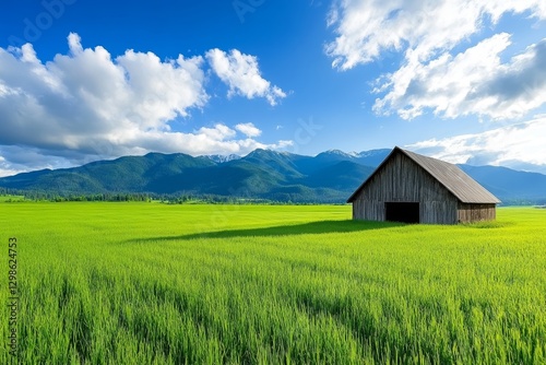 scenic, countryside, field, small, wooden, barn, surrounded, lush, green, grass