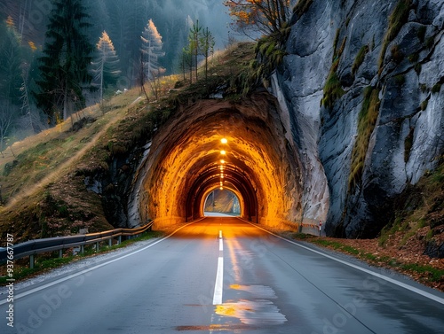 A scenic road leads through a picturesque tunnel in the mountains, illuminated by soft lights during early morning mist