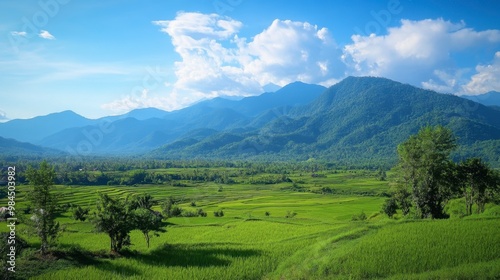 A scenic shot of the mountains and rice terraces in Pai, a backpacker paradise in northern Thailand.