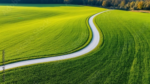 A scenic view of a winding road through lush green fields, showcasing nature's beauty and tranquility during a sunny day.