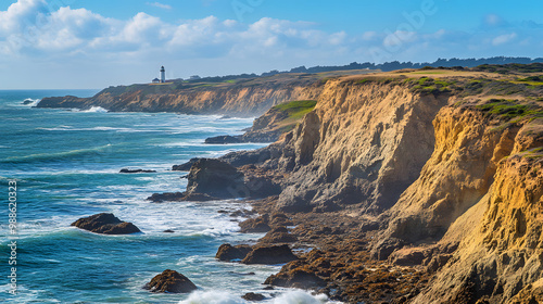 A scenic view of coastal cliffs with the ocean waves crashing against them and a lighthouse in the distance.