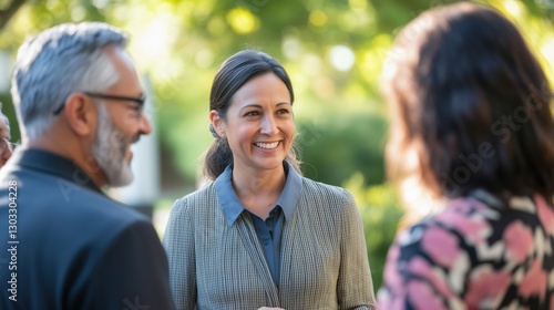 A school administrator networking with community leaders for support, action shot, in an outdoor event, using engaging composition