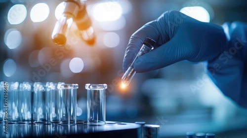 A scientist conducts a test in a laboratory, carefully adding liquid to a test tube with precision and focus.