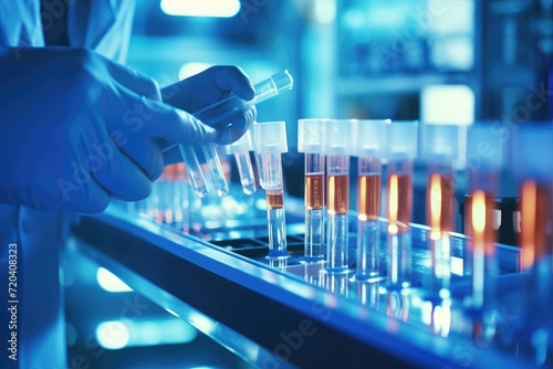 A scientist in a lab coat is carefully holding a test tube filled with a chemical solution, Scientist pipetting samples in laboratory, AI Generated