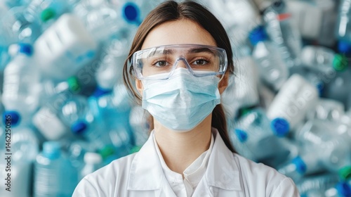 A scientist wearing a mask and goggles stands in front of a pile of plastic bottles, highlighting recycling and environmental concerns.