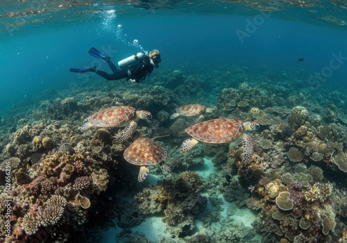 turtle, ocean, diving, sea, underwater, coral, reef, diver, marin, life, adventure, wildlife, tropical, aqualung, exploration, nature, water, animal, travel, holiday, vacation, blue, tour tourism, aquatic, ecosystem, conservation, environment, sport, activity, recreation, oceanic, depth, swim, ocean life, undersea