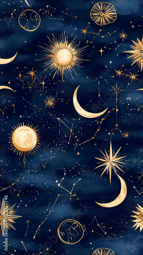 A seamless dark blue celestial pattern featuring glowing stars, crescent moons, and intricate sun motifs, all framed by astrological symbols like the zodiac signs