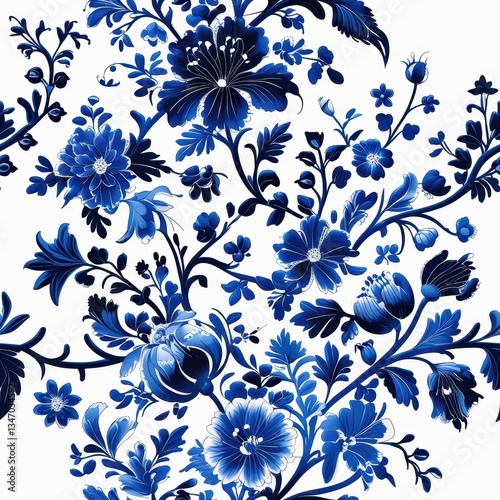 A seamless floral motif featuring deep blue botanical elements.